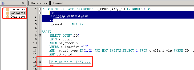 遇到一个存储过程,无法折叠语句,工具也没有解析出段落标记。 编写和调试过程中就不太方便,而且总感觉哪里不对。 偶尔的时候,编译出现错误,还以为是哪里少写了分号或者end造成的,仔细找找也没有。 下面这个是正常的程序,是 ...