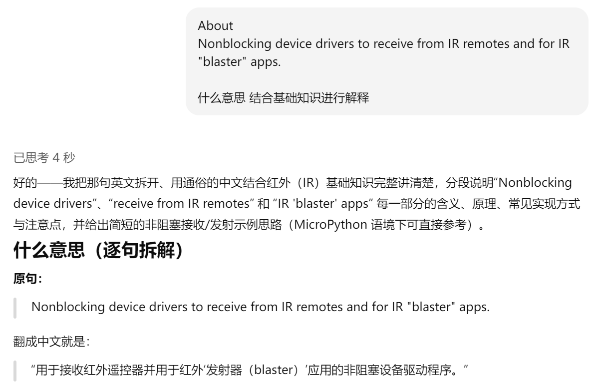 第三课 如何使用 AI 工具辅助快速阅读陌生代码 摘要: 本文以MicroPython红外传感器驱动为例,3步搞定代码阅读,快速上手新模块开发。 对于新手而言,首次阅读 ...
