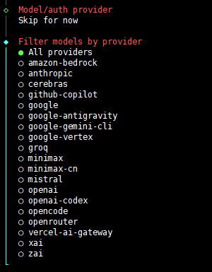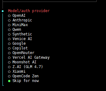 因为笔者使用 moonshot 国内模型,但是 OpenClaw 的配置是国际的会导致接口地址错误,所以笔者先选择 Skip for now 跳过大模型配置,后面再单独设置要使用的模型即可。
