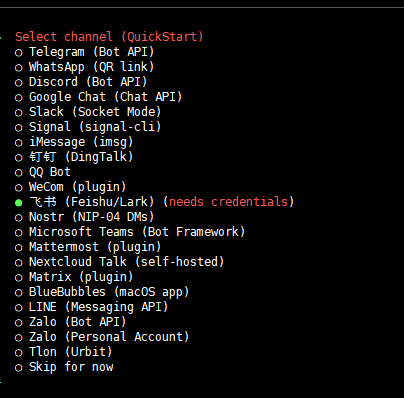 配置要使用的对话应用,如果用飞书,按要求填参数即可。这里可选 Skip for now ,先跳过选择,后面笔者会单独用一节内容讲解怎么配置。