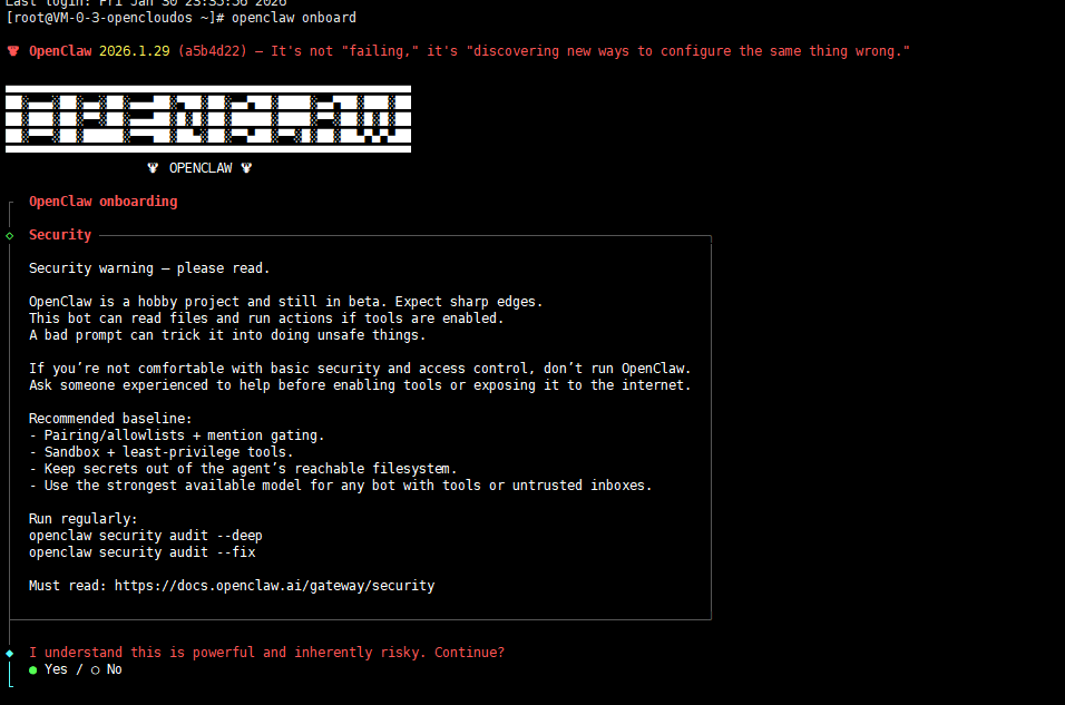 操作说明:通过左右方向键切换 Yes/No 选项,选择 Yes 即表示已了解 OpenClaw 权限相关风险,同意继续配置。