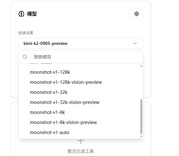 到 https://platform.moonshot.cn/console/api-keys 新建一个 key,到 https://platform.moonshot.cn/playground 查看支持的模型。