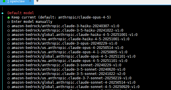 进入 Default model 选择界面时,可任意选择一个模型临时占位——该配置后续将通过修改配置文件覆盖,不影响最终使用效果。