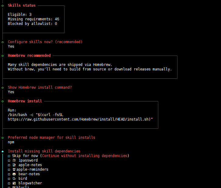 配置技能,可以选 Yes,根据提示安装一些常用的工具。