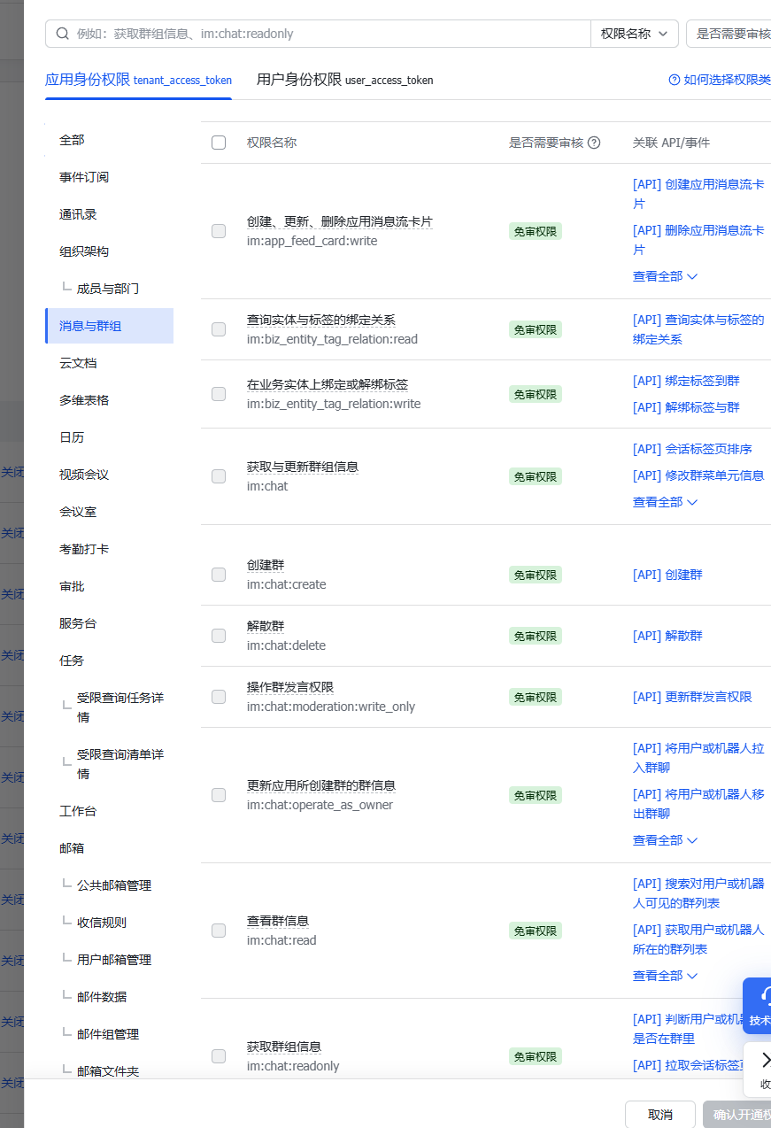 配置权限管理,把消息与群组的权限都开通。