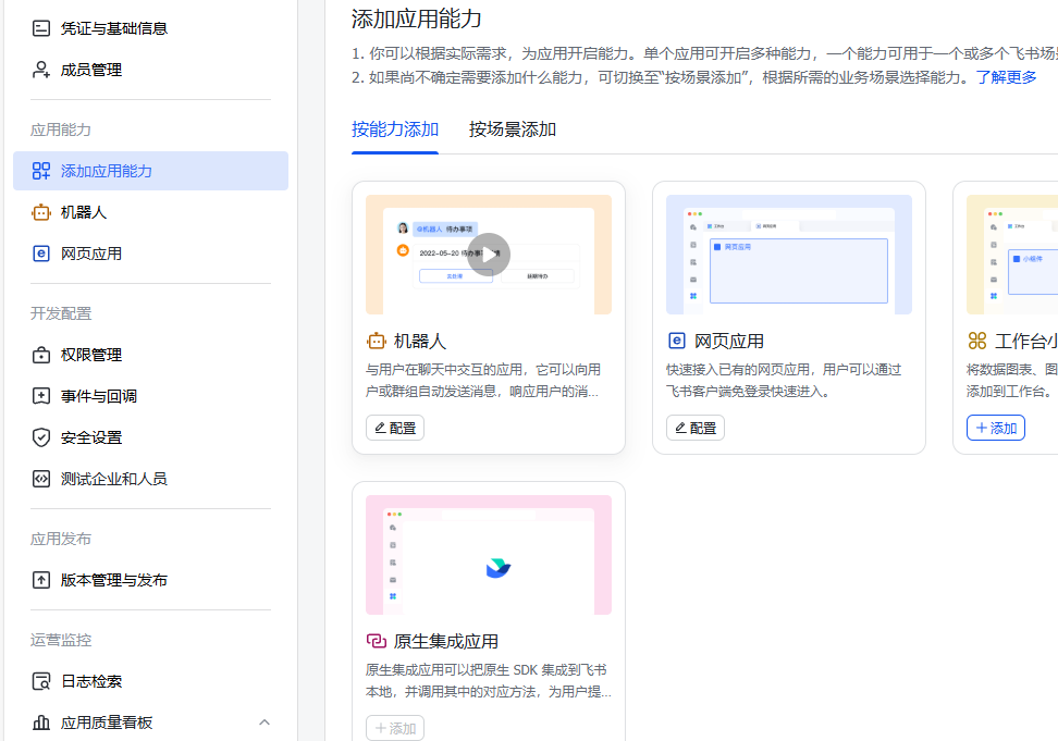 打开飞书应用管理后台,添加应用能力,选择机器人。