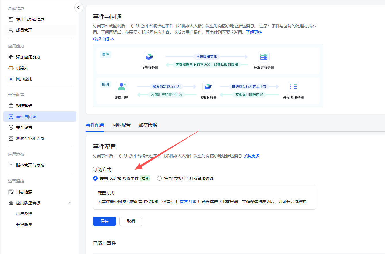 配置事件和回调,使用长连接,并且添加消息相关的事件。