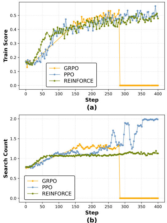 算法单跳QA平均搜索次数多跳QA平均搜索次数总平均搜索次数REINFORCE1.021.681.35PPO1.961.981.97GRPO1.031.841.44REINFORCE在简单的单跳问题上只搜索约1次,在复杂的多跳问题上增加到约1.7次——它学会了根据任务难度自适应调整搜索次数。而PPO则不管问题难易,始终保持约2次搜索,缺乏灵活性。