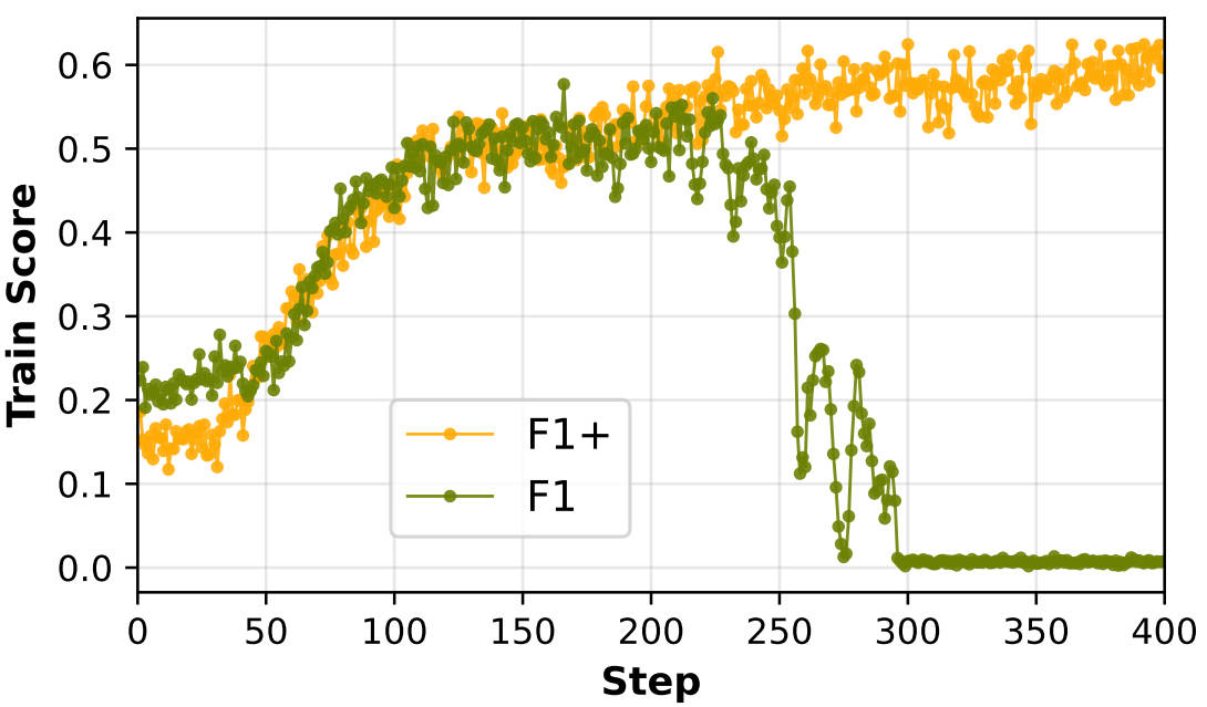 - F1+训练曲线恢复稳定,消除了回答逃避现象