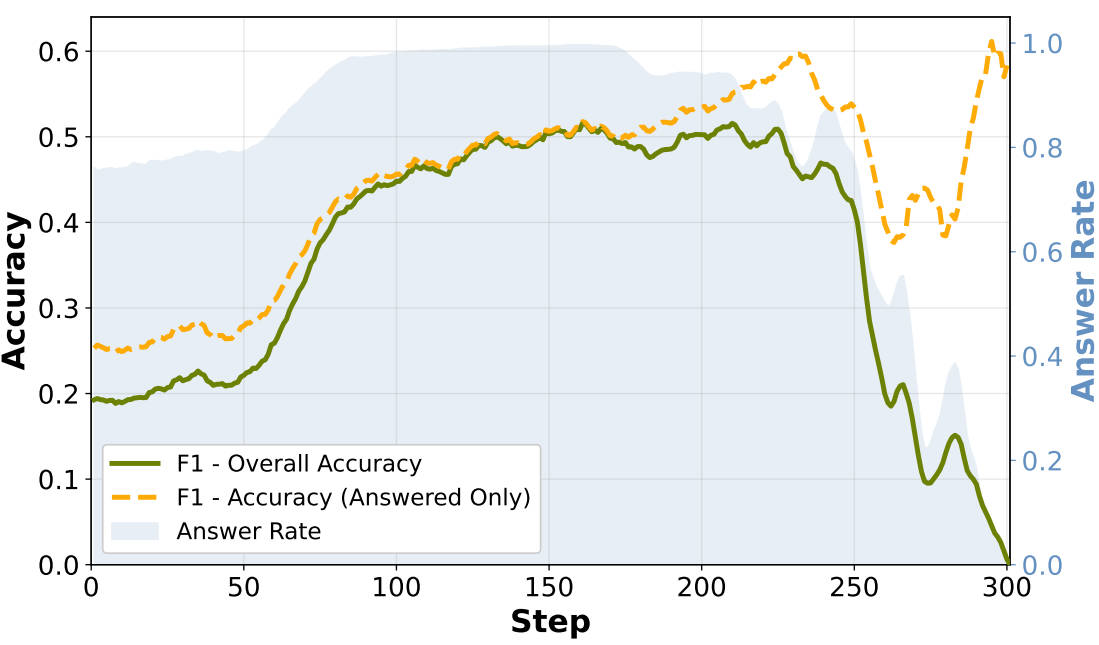 如图所示,当训练分数骤降时,回答率(Answer Rate)也同步大幅下降,但已回答样本的准确率却保持相对稳定。这说明模型并不是"答错了",而是干脆不回答了。