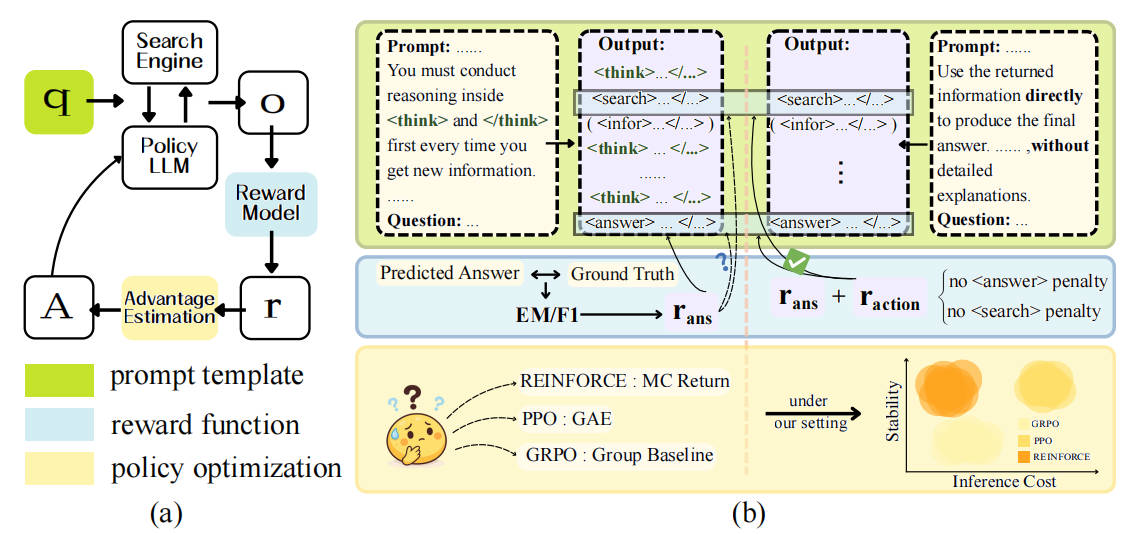 论文以Search-R1作为基础框架,严格复现其架构、数据集和检索器,在此受控环境下系统地研究RL训练的三个关键组件: