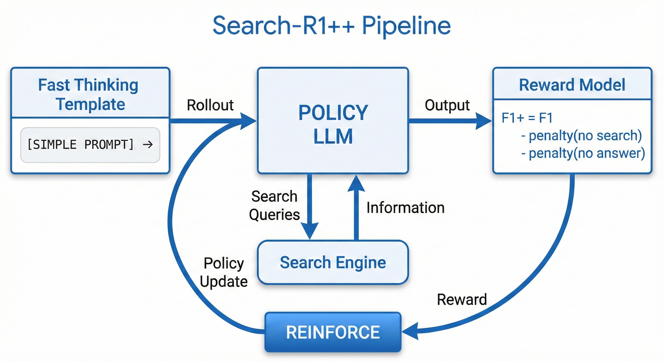 简单来说,就是在F1奖励的基础上,对"不搜索"和"不回答"这两种行为施加轻量级惩罚。这迫使模型必须积极参与搜索和回答过程,而不能"躺平"。