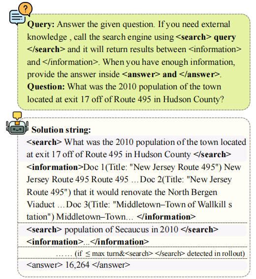 慢思考模板(Slow Thinking):要求模型每次获取新信息后,先在...标签内进行显式推理,然后再决定搜索或回答。这是Search-R1等现有系统普遍采用的方式。